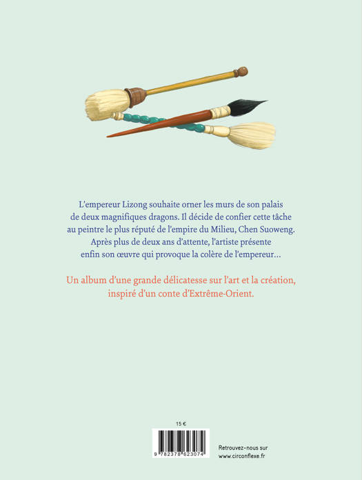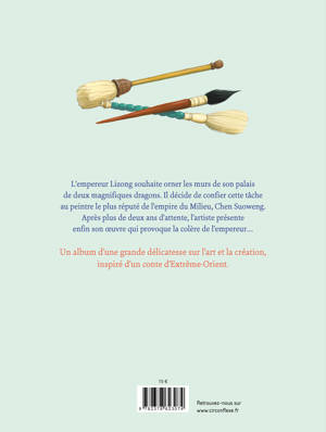 L'empereur Lizong souhaite orner la grande salle de son palais de magnifiques peintures de dragons. Il confie cette tâche délicate à Chen Suoweng, considéré comme le plus grand peintre de l'empire du milieu. Après plus de deux années de travail et alors que l'empereur s'impatiente dangereusement, le peintre présente son travail : deux lignes brisées, l'une jaune et l'autre bleue. Une approche originale et subtile de la création et de l'imaginaire. Inspiré d'une légende d'Extrême-Orient, ce texte d'une sensibilité et d'une poésie indéniables est magnifiquement illustré par le pinceau délicat de Virginie Grosos.