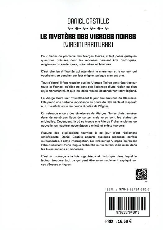 Pour traiter du problème des Vierges Noires, il faut poser quelques questions précises dont les réponses peuvent être historiques, religieuses ou ésotériques, voire même alchimiques. C'est dire les difficultés qui attendent le chercheur et le curieux qui voudraient se pencher sur leur énigme, puisque c'en est une. Tout d'abord, il faut rappeler que les Vierges Noires sont réparties sur toute la France, qu'elles ne sont pas l'apanage d'une région ou d'un style monumental, et que les idées reçues les concernant sont légions. La Vierge Noire voit officiellement le jour aux environs du XIe siècle. Elle prend une certaine importance au cours du XIIe siècle et disparaît au XIIIe siècle sous les coups répétés de l'Église. On retrouve encore des simulacres de Vierges Noires christianisées dans de nombreux lieux de cultes, mais rares sont les statuettes originelles. Cependant, là où se trouve une Vierge Noire, ancienne ou nouvelle, un mystère moyenâgeux a existé et existe toujours. Aucune des explications fournies à ce jour n'est réellement satisfaisante. Daniel Castille apporte quelques réponses, parfois surprenantes, à cette interrogation. Ce livre sur les Vierges Noires est l'aboutissement d'une longue recherche sur le terrain, mais aussi dans les livres anciens et modernes. C'est un ouvrage à la fois mystérieux et historique dans lequel le lecteur trouvera tout ce qui peut être raisonnablement expliqué sur ces déesses antiques.