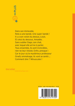Nola a une bande, une super bande ! Il y a Louis et Amadeo, ses deux meilleurs copains. Sans oublier Dago, son chat hyper intelligent, auquel il ne manque que la parole... À eux quatre, ils sont invincibles, rien ne leur résiste ! Mais le jour où une nouvelle voisine emménage, tout va basculer. Car le professeur Orwitz, aussi mystérieuse que jolie, semble avoir de nombreux secrets et la bande est bien décidée à découvrir ce qu'elle cache ! Un roman illustré en couleurs pour les jeunes lecteurs avides d'aventure et d'action!