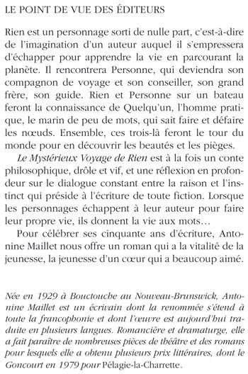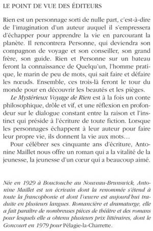Rien est un personnage sorti de nulle part, c'est-à-dire de l'imagination d'un auteur auquel il s'empressera d'échapper pour apprendre la vie en parcourant la planète. Il rencontrera Personne, qui deviendra son compagnon de voyage et son conseiller, son grand frère, son guide. Rien et Personne sur un bateau feront la connaissance de Quelqu'un, l'homme pratique, le marin de peu de mots, qui sait faire et défaire les noeuds. Ensemble, ces trois-là feront le tour du monde pour en découvrir les beautés et les pièges. Le Mystérieux Voyage de Rien est à la fois un conte philosophique, drôle et vif, et une réflexion en profondeur sur le dialogue constant entre la raison et l'instinct qui préside à l'écriture de toute fiction. Lorsque les personnages échappent à leur auteur pour faire leur propre vie, ils donnent la vie aux mots... «Pour célébrer ses cinquante ans d'écriture, Antonine Maillet nous offre un roman qui a la vitalité de la jeunesse, la jeunesse d'un coeur qui a beaucoup aimé. Née en 1929 à Bouctouche au Nouveau- Brunswick, Antonine Maillet est un écrivain dont la renommée s'étend à toute la francophonie et dont l'oeuvre est aujourd'hui traduite en plusieurs langues. Romancière et dramaturge, elle a fait paraître de nombreuses pièces de théâtre et des romans pour lesquels elle a obtenu plusieurs prix littéraires, dont le Goncourt en 1979 pour Pélagie-la-Charrette.»