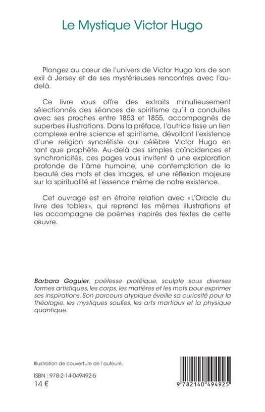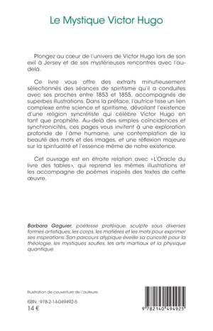 Plongez au coeur de l'univers de Victor Hugo lors de son exil à Jersey et de ses mystérieuses rencontres avec l'au- delà. Ce livre vous offre des extraits minutieusement sélectionnés des séances de spiritisme qu'il a conduites avec ses proches entre 1853 et 1855, accompagnés de superbes illustrations. Dans la préface, l'autrice tisse un lien complexe entre science et spiritisme, dévoilant l'existence d'une religion syncrétiste qui célèbre Victor Hugo en tant que prophète. Au-delà des simples coïncidences et synchronicités, ces pages vous invitent à une exploration profonde de l'âme humaine, une contemplation de la beauté des mots et des images, et une réflexion majeure sur la spiritualité et l'essence même de notre existence. Cet ouvrage est en étroite relation avec L'Oracle du livre des tables, qui reprend les mêmes illustrations et les accompagne de poèmes inspirés des textes de cette oeuvre.