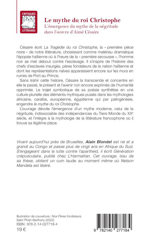 Césaire écrit La Tragédie du roi Christophe , la « première pièce noire » de notre littérature, choisissant comme matériau dramatique l'épopée haïtienne où à l'heure de la « première secousse », l'homme noir se met debout contre l'esclavage. Il s'inspire de l'histoire des chefs d'esclaves insurgés, pères fondateurs de la nation haïtienne et dont les représentations naïves apparaissent encore sur les murs en ruines de Port-au-Prince. Sans trahir cette histoire, Césaire la transcende et concentre en elle le passé, le présent et l'avenir non encore exprimés de l'humanité opprimée. Le trajet symbolique de sa poésie synthétise en une culture plurielle des éléments mythiques puisés dans les mythologies africaine, caraïbe, européenne, égyptienne qui par palingénésie, engendre le mythe du roi Christophe. L'ouvrage dévoile l'émergence d'un mythe moderne, celui de la négritude, indissociable des indépendances du Tiers-Monde du XXe siècle, et l'intègre à la mythologie de la littérature francophone où il trouve sa légitime place.