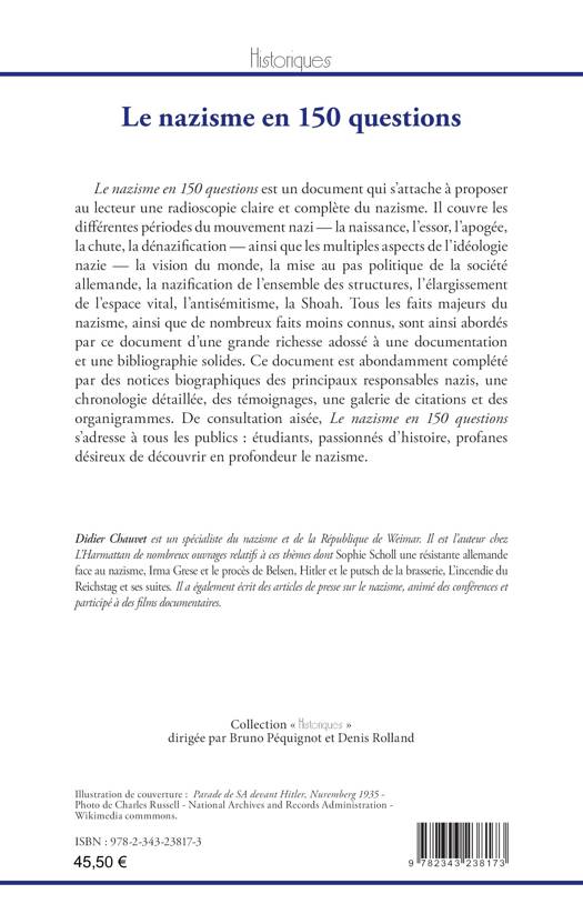 Le nazisme en 150 questions est un document qui s’attache à proposer au lecteur une radioscopie claire et complète du nazisme. Tous les faits majeurs du nazisme, ainsi que de nombreux faits moins connus, sont ainsi abordés par ce document d’une grande richesse adossé à une documentation et une bibliographie solides. Ce document est abondamment complété par des notices biographiques des principaux responsables nazis, une chronologie détaillée, des témoignages, une galerie de citations et des organigrammes. De consultation aisée, cet ouvrage s’adresse à tous les publics : étudiants, passionnés d’histoire, profanes désireux de découvrir en profondeur le nazisme.