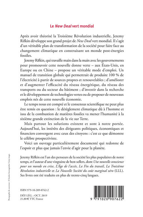 Après avoir théorisé la Troisième Révolution industrielle, Jeremy Rifkin développe son grand projet de «New Deal »vert mondial. Il s'agit d'un véritable plan de transformation de la société pour faire face au changement climatique en construisant un monde post-énergies fossiles.