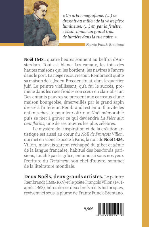 Noël 1648 : quatre heures sonnent au beffroi d'Amsterdam. Toutest blanc. Les canaux, les toits des hautes maisons qui les bordent, les naviresà l'ancre dans le port. La neige recouvre tout. Rembrandt quitte sa maison de laJoden-Breedenstraat, dans le quartier juif. Le peintre vieillissant, qu'a fui lesuccès, promène dans les rues froides son coeur en clair-obscur. Des enfantspauvres se pressent aux carreaux d'une maison bourgeoise, émerveillés par legrand sapin dressé à l'intérieur. Rembrandt est ému. Il invite les enfants chezlui pour leur offrir un Noël mémorable puis se met à graver ce qui deviendra "LaPièce aux cent florins", une de ses oeuvres les plus célèbres. Lemystère de l'inspiration et de la création artistique est aussi au coeur du Noëlde François Villon, qui met en scène le poète à Paris, la nuit de Noël 1456.Villon, mauvais garçon réchappé du gibet et génie de la langue française,habitué des bas-fonds parisiens touché par la grâce entame ici sous nos yeuxl'écriture du "Testament", son chef-d'oeuvre, sommet de la littérature mondiale. Deux Noëls, deux grands artistes. Le peintre Rembrandt (1606 -1669) et le poète François Villon (1431 - après 1463), héros de ces deux brefsrécits historiques, revivent ici sous la plume de Frantz Funck-Brentano.