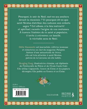 Pourquoi, le soir de Noël, met-on ses souliers devant la cheminée ? Et pourquoi dit-on que saint Nicolas distribue des cadeaux aux enfants sages ? Cet album, à la fois instructif et spirituel, raconte l'origine de ces coutumes. À travers l'histoire de ce saint si populaire, il invite à retrouver, en famille, le véritable sens de Noël. Odile Haumonté est journaliste, éditrice jeunesse et rédactrice en chef du magazine Patapon. Auteur d'une soixantaine de livres, elle est très attachée à saint Nicolas, patron de la Lorraine où elle habite. Hengjing Zang, illustratrice chinoise, est diplômée de l'Université de Pékin et de l'École Émile-Cohl. Elle utilise l'aquarelle, l'encre de Chine et les papiers découpés. Elle publie en France et en Chine.