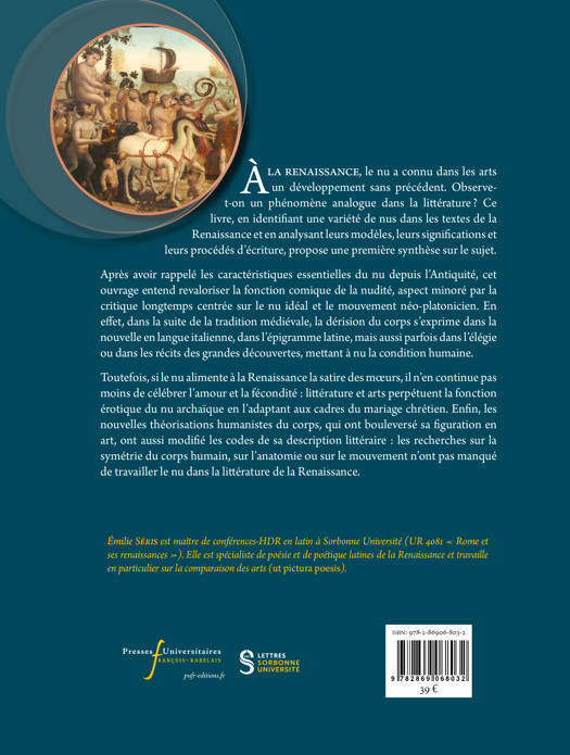 A la Renaissance, le nu a connu dans les arts un développement sans précédent. Observe-t-on un phénomène analogue dans la littérature ? Ce livre, en identifiant une variété de nus dans les textes de la Renaissance et en analysant leurs modèles, leurs significations et leurs procédés d’écriture, propose une première synthèse sur le sujet. Après avoir rappelé les caractéristiques essentielles du nu depuis l’Antiquité, cet ouvrage entend revaloriser la fonction comique de la nudité, aspect minoré par la critique longtemps centrée sur le nu idéal et le mouvement néo-platonicien. En effet, dans la suite de la tradition médiévale, la dérision du corps s’exprime dans la nouvelle en langue italienne, dans l’épigramme latine, mais aussi parfois dans l’élégie ou dans les récits des grandes découvertes, mettant à nu la condition humaine. Toutefois, si le nu alimente à la Renaissance la satire des moeurs, il n’en continue pas moins de célébrer l’amour et la fécondité : littérature et arts perpétuent la fonction érotique du nu archaïque en l’adaptant aux cadres du mariage chrétien. Enfin, les nouvelles théorisations humanistes du corps, qui ont bouleversé sa figuration en art, ont aussi modifié les codes de sa description littéraire : les recherches sur la symétrie du corps humain, sur l’anatomie ou sur le mouvement n’ont pas manqué de travailler le nu dans la littérature de la Renaissance.