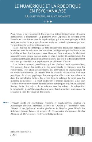 La psychanalyse nous enseigne que le Moi n’est pas maître en sa propre maison. Avec la naissance des machines intelligentes, du numérique et des robots, non seulement le Moi n’est pas maître en sa propre demeure, mais, en plus, il est invité à migrer dans de nouveaux espaces, qui augmentent certaines partie de sa vie psychique, ou en oblitèrent d’autres. Les transformations psychiques qui en résultent sont considérables ! Cet ouvrage donne des outils conceptuels et cliniques pour les comprendre, au travers de trois parties : la place du virtuel dans le champ psychique (virtuel psychique, et psychopathologie des troubles limites) ; la relation du sujet avec le numérique (sujet augmenté, homme augmenté, numérique et médiations numériques dans la cure) ; enfin, sa relation aux robots (robophilie, robophobie, médiations robotiques avec l’enfant autiste, et sexualité à l’ère de l’image et des robots).