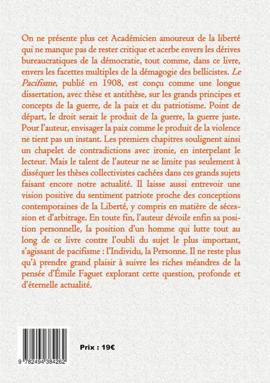 On ne présente plus cet Académicien amoureux de la liberté qui ne manque pas de rester critique et acerbe envers les dérives bureaucratiques de la démocratie, tout comme, dans ce livre, envers les facettes multiples de la démagogie des bellicistes. Le Pacifisme, publié en 1908, est conçu comme une longue dissertation, avec thèse et antithèse, sur les grands principes et concepts de la guerre, de la paix et du patriotisme. Point de départ, le droit serait le produit de la guerre, la guerre juste. Pour l'auteur, envisager la paix comme le produit de la violence ne tient pas un instant. Les premiers chapitres soulignent ainsi un chapelet de contradictions avec ironie, interpelant le lecteur. Mais le talent de l'auteur ne se limite pas seulement à disséquer les thèses collectivistes cachées dans ces grands sujets faisant encore notre actualité. Il laisse aussi entrevoir une vision positive du sentiment patriote proche des conceptions contemporaines de la Liberté, y compris en matière de sécession et d'arbitrage. En toute fin, l'auteur dévoile enfin sa position personnelle, la position d'un homme qui lutte tout au long de ce livre contre l'oubli du sujet le plus important, s'agissant de pacifisme : l'Individu, la Personne. Reste à prendre plaisir à suivre les riches méandres de la pensée d'Émile Faguet explorant cette question, profonde et d'éternelle actualité.