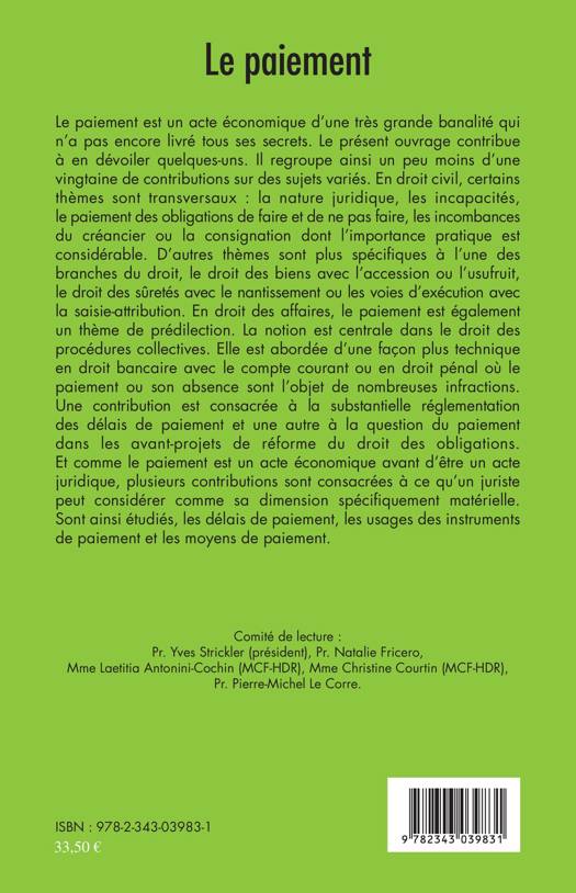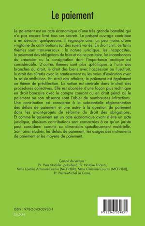 En droit, la notion de paiement est un thème récurrent, que ce soit en droit civil, en droit des affaires, en droit bancaire ou encore en droit des procédures collectives. Comme le paiement est un acte économique avant d'être un acte juridique, plusieurs contributions sont consacrées à ce qu'un juriste peut considérer comme sa dimension matérielle. Le présent ouvrage contribue à dévoiler quelques-uns des secrets de l'acte de paiement. Il étudie les délais de paiement, les usages des instruments de paiement et les moyens de paiement.
