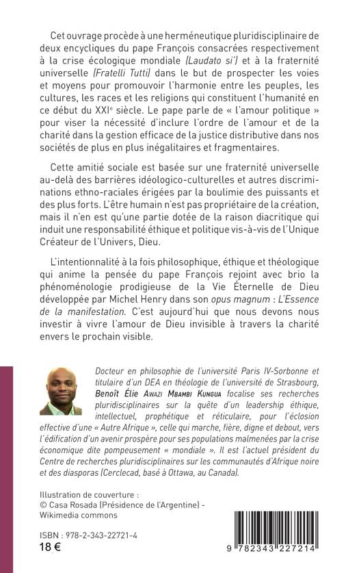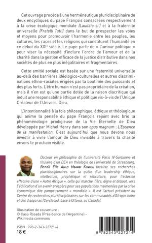 Cet ouvrage procède à une herméneutique pluridisciplinaire de deux encycliques du pape François consacrées respectivement à la crise écologique mondiale (Laudato si’) et à la fraternité universelle (Fratelli Tutti) dans le but de prospecter les voies et moyens pour promouvoir l’harmonie entre les peuples, les cultures, les races et les religions qui constituent l’humanité en ce début du XXIe siècle.