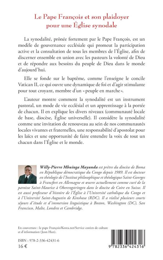 La synodalité, prônée fortement par le Pape François, est un modèle de gouvernance ecclésiale qui promeut la participation active et la consultation de tous les membres de l'Église, afin de discerner ensemble en union avec les pasteurs la volonté de Dieu et de répondre aux besoins du peuple de Dieu dans le monde d'aujourd'hui. Elle se fonde sur le baptême, comme l'enseigne le concile Vatican II, ce qui ouvre une dynamique de foi et d'agir stimulante pour tout croyant, membre d'un peuple en marche . L'auteur montre comment la synodalité est un instrument pastoral, un mode de vie ecclésial et un apprentissage à la portée de chacun. Il en explique les divers niveaux (communauté locale de base, diocèse, Église universelle). Il considère la synodalité comme une invitation de renouveau au sein de nos communautés locales vivantes et fraternelles, une responsabilité d'apostolat pour les laïcs et une opportunité de faire entendre la voix de tout un chacun dans l'Église et le monde.