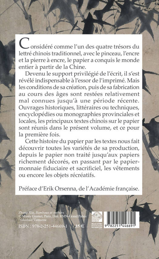 Considere comme l'un des quatre tresors du lettre chinois traditionnel, avec le pinceau, l'encre et la pierre a encre, le papier a conquis le monde entier a partir de la Chine. Devenu le support privilegie de l'ecrit, il s'est revele indispensable a l'essor de l'imprime. Mais les conditions de sa creation, puis de sa fabrication au cours des ages sont restees relativement mal connues jusqu'a une periode recente. Ouvrages historiques, litteraires ou techniques, encyclopedies ou monographies provinciales et locales, les principaux textes chinois sur le papier sont reunis dans le present volume, et ce pour la premiere fois. Cette histoire du papier par les textes nous fait decouvrir toutes les varietes de sa production, depuis le papier non traite jusqu'aux papiers richement decores, en passant par le papiermonnaie fiduciaire et sacrificiel, les vetements ou encore les objets recreatifs. Preface d'Erik Orsenna, de l'Academie francaise.