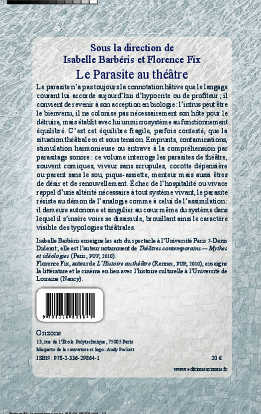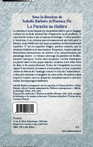 Ce volume interroge les parasites de théâtre, souvent comiques, viveur sans scrupules, cocotte dépensière ou parent sans le sou, pique-assiette, menteur mais aussi êtres de désir et de renouvellement. Échec de l'hospitalité ou vivace rappel d'une altérité nécessaire à tout système vivant, le parasite résiste au démon de l'analogie et à celui de l'assimilation : il demeure autonome et singulier au cur même du système dans lequel il s'insère ou se dissimule, brouillant le caractère visible des typologies théâtrales.