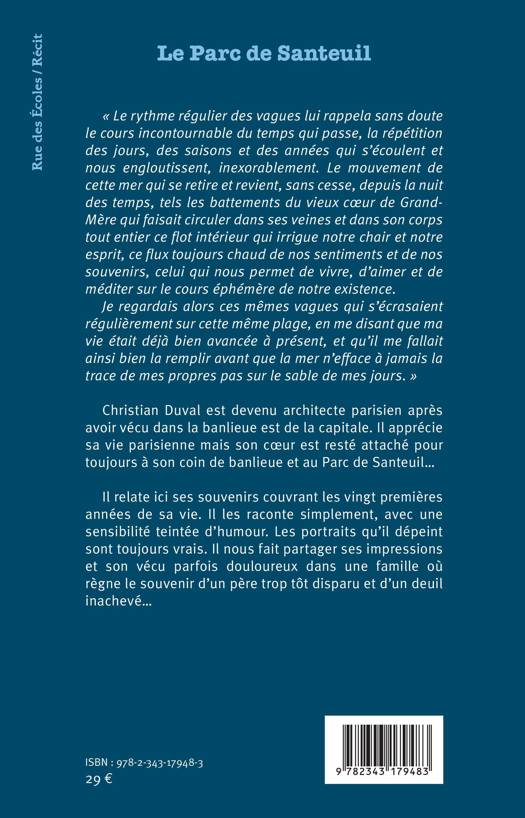 Christian Duval est devenu architecte parisien après avoir vécu dans la banlieue est de la capitale. Il apprécie sa vie parisienne mais son coeur est resté attaché pour toujours à son coin de banlieue et au Parc de Santeuil Il relate ici ses souvenirs couvrant les vingt premières années de sa vie. Il les raconte simplement, avec une sensibilité teintée d'humour. Les portraits qu'il dépeint sont toujours vrais. Il nous fait partager ses impressions et son vécu parfois douloureux dans une famille où règne le souvenir d'un père trop tôt disparu et d'un deuil inachevé