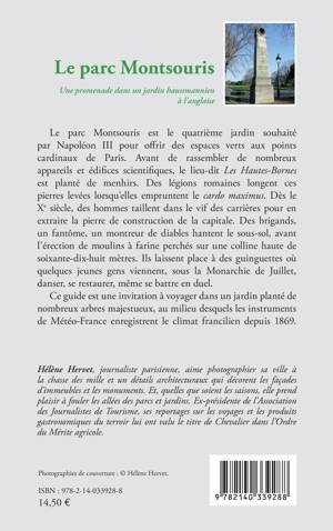 Le parc Montsouris est le quatrième jardin souhaité par Napoléon III pour offrir des espaces verts aux points cardinaux de Paris. Avant de rassembler de nombreux appareils et édifices scientifiques, le lieu-dit Les Hautes-Bornes est planté de menhirs. Des légions romaines longent ces pierres levées lorsqu'elles empruntent le cardo maximus. Dès le Xe siècle, des hommes taillent dans le vif des carrières pour en extraire la pierre de construction de la capitale. Des brigands, un fantôme, un montreur de diables hantent le sous-sol, avant l'érection de moulins à farine perchés sur une colline haute de soixante-dix-huit mètres. Ils laissent place à des guinguettes où quelques jeunes gens viennent, sous la Monarchie de Juillet, danser, se restaurer, même se battre en duel. Ce guide est une invitation à voyager dans un jardin planté de nombreux arbres majestueux, au milieu desquels les instruments de Météo-France enregistrent le climat francilien depuis 1869.