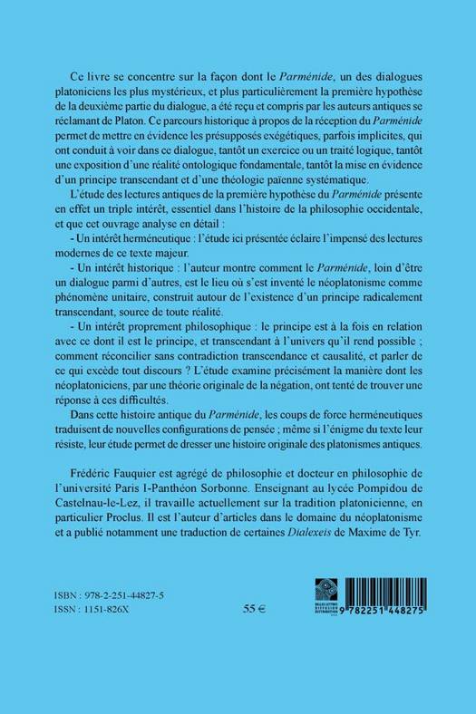 English Summary: This book focuses on how the Parmenides, one of the most mysterious Platonic dialogues, and more particularly the first hypothesis of the second part of the dialogue, was received and understood by the ancient writers claiming Plato. French Description: Ce livre se concentre sur la facon dont le Parmenide, un des dialogues platoniciens les plus mysterieux, et plus particulierement la premiere hypothese de la deuxieme partie du dialogue, a ete recu et compris par les auteurs antiques se reclamant de Platon. Ce parcours historique a propos de la reception du Parmenide permet de mettre en evidence les presupposes exegetiques, parfois implicites, qui ont conduit a voir dans ce dialogue, tantot un exercice ou un traite logique, tantot une exposition d'une realite ontologique fondamentale, tantot la mise en evidence d'un principe transcendant et d'une theologie paienne systematique. L'etude des lectures antiques de la premiere hypothese du Parmenide presente en effet un triple interet, essentiel dans l'histoire de la philosophie occidentale, et que cet ouvrage analyse en detail: Un interet hermeneutique: l'etude ici presentee eclaire l'impense des lectures modernes de ce texte majeur. Un interet historique: l'auteur montre comment le Parmenide, loin d'etre un dialogue parmi d'autres, est le lieu ou s'est invente le neoplatonisme comme phenomene unitaire, construit autour de l'existence d'un principe radicalement transcendant, source de toute realite. Un interet proprement philosophique: le principe est a la fois en relation avec ce dont il est le principe, et transcendant a l'univers qu'il rend possible; comment reconcilier sans contradiction transcendance et causalite, et parler de ce qui excede tout discours ? L'etude examine precisement la maniere dont les neoplatoniciens, par une theorie originale de la negation, ont tente de trouver une reponse a ces difficultes. Dans cette histoire antique du Parmenide, les coups de force hermeneutiques traduisent de nouvelles configurations de pensee; meme si l'enigme du texte leur resiste, leur etude permet de dresser une histoire originale des platonismes antiques.