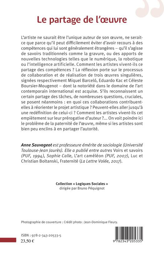 L'artiste ne saurait être l'unique auteur de son uvre, ne serait-ce que parce qu'il peut difficilement éviter d'avoir recours à des compétences qui lui sont généralement étrangères - qu'il s'agisse de savoirs traditionnels comme la gravure, ou des apports de nouvelles technologies telles que le numérique, la robotique, ou l'intelligence artificielle. Comment les artistes vivent-ils ce partage de compétences ? La réflexion porte sur le processus de collaboration et de réalisation de trois uvres singulières, signées respectivement Miquel Barceló, Eduardo Kac et Céleste Boursier-Mougenot.