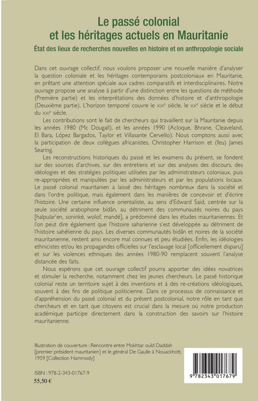 Le passé historique colonial reste un territoire sujet à des inventions et à des re-créations idéologiques, souvent à des fins politiciennes, c'est pourquoi cet ouvrage collectif cherche à proposer une nouvelle manière d'analyser la question coloniale et les héritages contemporains postcoloniaux en Mauritanie. L'horizon temporel couvre les XIXe, XXe et XXIe siècles.