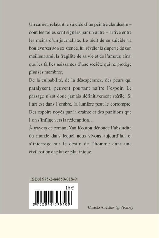 Un carnet relatant le suicide d'un peintre clandestin - dont les toiles sont signées par un autre - arrive entre les mains d'un journaliste, Carfentan. Le récit de ce suicide va bouleverser son existence, lui révéler la duperie de son meilleur ami, la fragilité de sa vie et de l'amour, ainsi que les failles naissantes d'une société qui ne protège plus ses membres. A travers ce roman, Yan Kouton dénonce l'absurdité du monde dans lequel nous vivons aujourd'hui et s'interroge sur le destin de l'homme dans une civilisation de plus en plus inique.