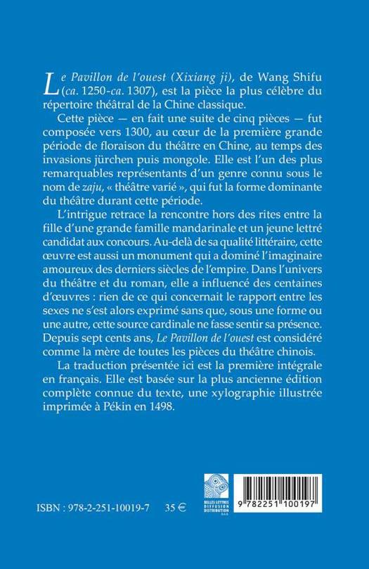 Le Pavillon de l'ouest (Xixiang ji), de Wang Shifu (ca. 1250-ca. 1307), est la piece la plus celebre du repertoire theatral de la Chine classique. Cette piece - en fait une suite de cinq pieces - fut composee vers 1300, au coeur de la premiere grande periode de floraison du theatre en Chine, au temps des invasions jurchen puis mongole. Elle est l'un des plus remarquables representants d'un genre connu sous le nom de zaju, theatre varie , qui fut la forme dominante du theatre durant cette periode. L'intrigue retrace la rencontre hors des rites entre la fille d'une grande famille mandarinale et un jeune lettre candidat aux concours. Au-dela de sa qualite litteraire, cette oeuvre est aussi un monument qui a domine l'imaginaire amoureux des derniers siecles de l'empire. Dans l'univers du theatre et du roman, elle a influence des centaines d'oeuvres: rien de ce qui concernait le rapport entre les sexes ne s'est alors exprime sans que, sous une forme ou une autre, cette source cardinale ne fasse sentir sa presence. Depuis sept cents ans, Le Pavillon de l'ouest est considere comme la mere de toutes les pieces du theatre chinois. La traduction presentee ici est la premiere integrale en francais. Elle est basee sur la plus ancienne edition complete connue du texte, une xylographie illustree imprimee a Pekin en 1498.