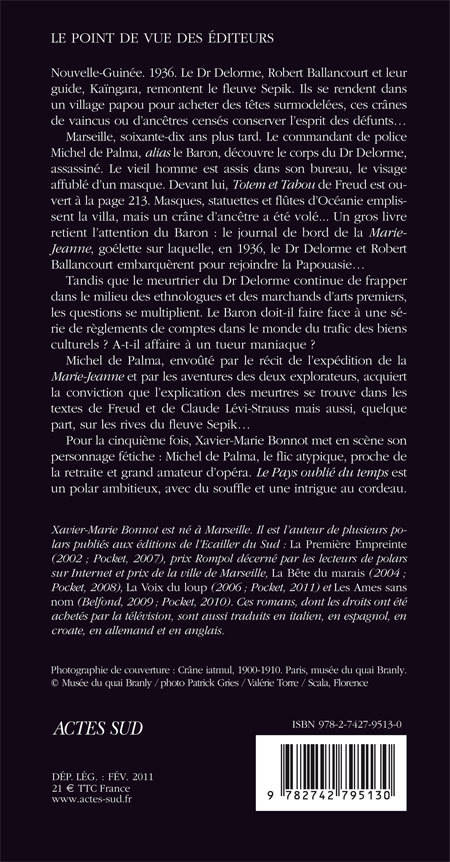 Nouvelle-Guinée, 1936. Le Dr Delorme, Robert Ballancourt et leur guide, Kaïngara, remontent le fleuve Sepik. Ils se rendent dans un village papou pour acheter des têtes surmodelées, ces crânes de vaincus ou d'ancêtres censés conserver l'esprit des défunts... Marseille, soixante-dix ans plus tard. Le commandant de police Michel de Palma, «alias» le Baron, découvre le corps du Dr Delorme, assassiné. Le vieil homme est assis dans son bureau, le visage affublé d'un masque. Devant lui, «Totem et Tabou» de Freud est ouvert à la page 213. Masques, statuettes et flûtes d'Océanie emplissent la villa, mais un crâne d'ancêtre a été volé... Un gros livre retient l'attention du Baron : le journal de bord de la «Marie-Jeanne», goélette sur laquelle, en 1936, le Dr Delorme et Robert Ballancourt embarquèrent pour rejoindre la Papouasie... Michel de Palma, envoûté par le récit de l'expédition de la «Marie-Jeanne» et par les aventures des deux explorateurs, acquiert la conviction que l'explication des meurtres se trouve dans les textes de Freud et de Claude Lévi-Strauss mais aussi, quelque part, sur les rives du fleuve Sepik... «Le Pays oublié du temps» est un polar ambitieux, avec du souffle et une intrigue au cordeau.