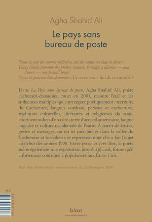 Dans "Le Pays sans bureau de poste" (publication originale en 1997), Agha Shahid Ali, poète cachemiri-étatsunien mort en 2001, raconte l'exil et les influences multiples qui convergent poétiquement : territoire du Cachemire, langues ourdoue, persane et cachemirie, traditions culturelles, littéraires et religieuses du sous-continent indien d'un côté , terre d'accueil américaine, langue anglaise et culture occidentale de l'autre. À partir de lettres, gestes et messages, on est ici précipité·es dans la vallée du Cachemire et la violence et répression dont elle a fait l'objet au début des années 1990. Entre prose et vers libre, le poète mène également une exploration jusqu'au ghazal, forme qu'il a fortement contribué à populariser aux États-Unis.