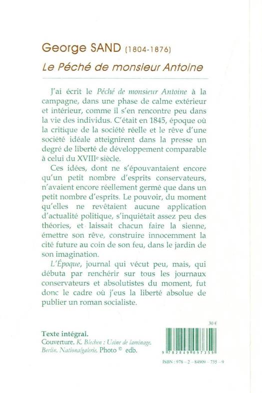 J'ai écrit le Péché de monsieur Antoine à la campagne, dans une phase de calme extérieur et intérieur, comme il s'en rencontre peu dans la vie des individus. C'était en 1845, époque où la critique de la société réelle et le rêve d'une société idéale atteignirent dans la presse un degré de liberté de développement comparable à celui du XVIIIe siècle.
