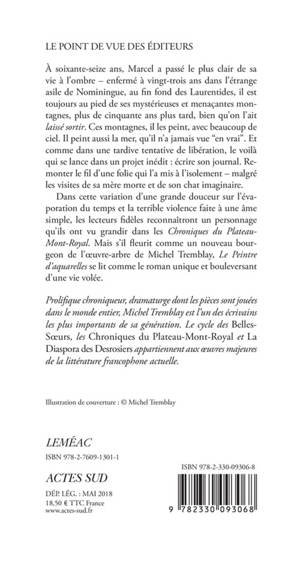 A 76 ans, Marcel a l'âme d'un enfant et le talent d'un artiste. Mers inventées ou montagnes omniprésentes, il peint des horizons monomaniaques, hanté par son environnement depuis que l'asile du coin a fermé et qu'on l'a laissé sortir. Rattrapé par ses cauchemars, Marcel commence un journal, tentative d'apprivoisement des mots, de sa propre folie, de sa mémoire pleine de rage et de fureur. Avec cette variation d'une grande douceur sur l'évaporation du temps et la terrible violence faite à une âme simple«, »Michel Tremblay signe le roman funambule et bouleversant d'une vie volée.