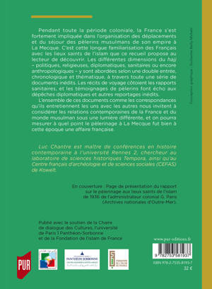 Pendant toute la période coloniale, la France s'est fortement impliquée dans l'organisation des déplacements et du séjour des pèlerins musulmans de son empire à La Mecque. Les différentes dimensions du hajj - politiques, religieuses, diplomatiques, sanitaires ou encore anthropologiques - y sont abordées selon une double entrée, chronologique et thématique, à travers toute une série de documents inédits. Les récits de voyage côtoient les rapports sanitaires, et les témoignages de pèlerins font écho aux dépêches diplomatiques et autres reportages inédits.