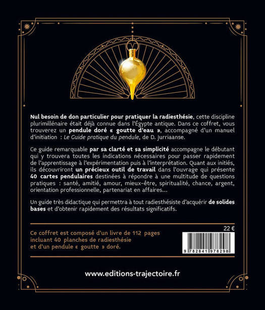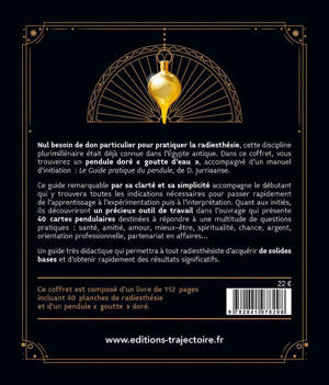 Nul besoin de don particulier pour pratiquer la radiesthésie, cette discipline plurimillénaire était déjà connue dans l'Égypte antique. Dans ce coffret, vous trouverez un pendule doré « goutte d'eau », accompagné d'un manuel d'initiation : « Le Guide pratique du pendule », de D. Jurriaanse. Ce guide remarquable par sa clarté et sa simplicité accompagne le débutant qui y trouvera toutes les indications nécessaires pour passer rapidement de l'apprentissage à l'expérimentation puis à l'interprétation. Quant aux initiés, ils découvriront un précieux outil de travail dans l'ouvrage qui présente 40 cartes pendulaires destinées à répondre à une multitude de questions pratiques : santé, amitié, amour, mieux-être, spiritualité, chance, argent, orientation professionnelle, partenariat en affaires… Un guide très didactique qui permettra à tout radiesthésiste d'acquérir de solides bases et d'obtenir rapidement des résultats significatifs. Ce coffret est composé d'un livre de 112 pages incluant 40 planches de radiesthésie.