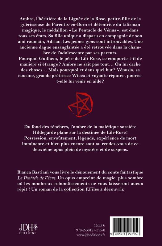 Ambre, l'héritière de la Lignée de la Rose, petite-fille de la guérisseuse de Parentis-en-Born et détentrice du talisman magique, le médaillon Le Pentacle de Vénus, est dans tous ses états. Sa fille unique a disparu en compagnie de son ami roumain, Adrian. Les jeunes gens sont introuvables. Une ancienne dague ensanglantée a été retrouvée dans la chambre de l'adolescente par ses parents. Pourquoi Guilhem, le père de Lili-Rose, se comporte-t-il de manière si étrange ? Ambre ne sait pas tout... On lui cache des choses... Mais pourquoi et dans quel but ? Vénusia, sa cousine, grande prêtresse Wicca et voyante réputée, pourra-t-elle lui venir en aide ? Du fond des ténèbres, l'ombre de la maléfique sorcière Hildegarde plane sur la destinée de Lili-Rose ! Possession, envoûtement, légende, expérience de mort imminente et bien plus encore sont au rendez-vous de ce deuxième opus plein de mystère et de suspens. Bianca Bastiani vous livre le dénouement du conte fantastique Le Pentacle de Vénus. Un opus empreint de magie, plus sombre où les nombreux rebondissements ne vous laisseront aucun répit ! Un roman de la collection F.Files à découvrir.