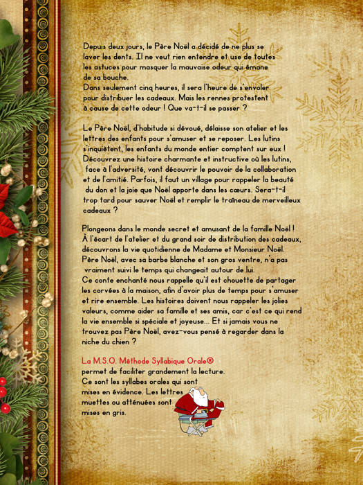 La M.S.O. Méthode Syllabique Orale® permet de faciliter grandement la lecture. Ce sont les syllabes orales qui sont mises en évidence. Les lettres muettes ou atténuées sont mises en gris. Les ponts phonétiques® permettent, eux, de montrer aux lecteurs débutants la découpe en syllabes à lire réellement. Le double espacement, la police sobre, la taille des caractères rendent accessibles aux DYS.