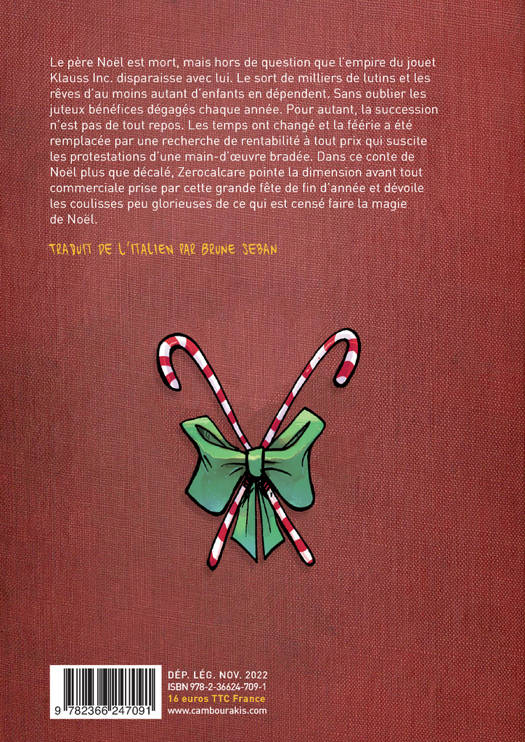Le père Noël est mort, mais hors de question que l'empire du jouet Klauss Inc. disparaisse avec lui. Le sort de milliers de lutins et les rêves d'au moins autant d'enfants en dépendent. Sans oublier les juteux bénéfices dégagés chaque année. Pour autant, la succession n'est pas de tout repos. Les temps ont changé et la féérie a été remplacée par une recherche de rentabilité à tout prix qui suscite les protestations d'une main-d'oeuvre bradée. Dans ce conte de Noël plus que décalé, Zerocalcare pointe la dimension avant tout commerciale prise par cette grande fête de fin d'année et dévoile les coulisses peu glorieuses de ce qui est censé faire la magie de Noël.