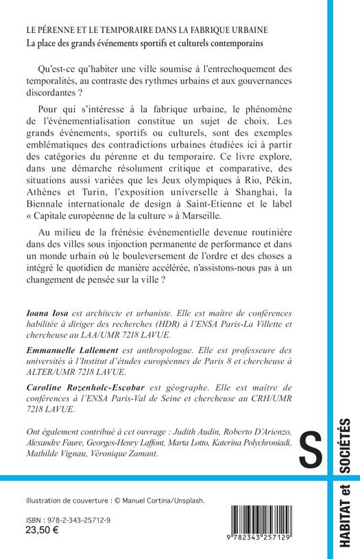 Qu’est-ce qu’habiter une ville soumise à l’entrechoquement des temporalités, au contraste des rythmes urbains et aux gouvernances discordantes ? Pour qui s’intéresse à la fabrique urbaine, le phénomène de l’événementialisation constitue un sujet de choix. Les grands événements, sportifs ou culturels, sont des exemples emblématiques des contradictions urbaines étudiées ici à partir des catégories du pérenne et du temporaire. Ce livre explore, dans une démarche résolument critique et comparative, des situations aussi variées que les Jeux olympiques à Rio, Pékin, Athènes et Turin, l’exposition universelle à Shanghai, la Biennale internationale de design à Saint-Etienne et le label « Capitale européenne de la culture » à Marseille. Au milieu de la frénésie événementielle devenue routinière dans des villes sous injonction permanente de performance et dans un monde urbain où le bouleversement de l’ordre et des choses a intégré le quotidien de manière accélérée, n’assistons-nous pas à un changement de pensée sur la ville ?