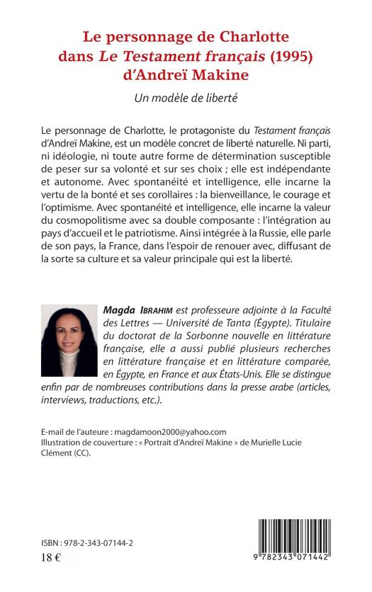 Cette étude littéraire originale de Magda Ibrahim développe la valeur du personnage de Charlotte dans le quatrième roman d'Andreï Makine. Elle s'attache à démontrer en quoi Charlotte est un modèle concret de liberté naturelle. Ni parti, ni idéologie, ni toute autre forme de détermination susceptible de peser sur sa volonté et sur ses choix ; elle est indépendante et autonome. Elle incarne l'intégration au pays d'accueil et le patriotisme, avec l'espoir de renouer avec la France et de diffuser sa culture et la notion de liberté.