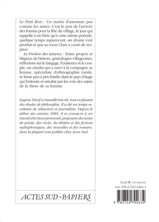 «Eugène Durif a travaillé très tôt, tout en faisant des études de philosophie. Il a été un temps secrétaire de rédaction et journaliste. Depuis le début des années 1980, il se consacre à un travail d'écriture personnel, proposant des textes de poésie, des récits, du théâtre et des fictions radiophoniques, des nouvelles et des romans, dont la plupart sont publiés chez Actes Sud.»
