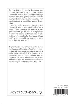 «Le Fredon des taiseux» : Entre propos et blagues de bistrors, généalogies villageoises, réflexions sur le langage, l'existence et le couple, un citadin qui a suivi à la campagne sa femme, spécialiste d'ethnographie rurale, se laisse peu à peu fondre dans le pays d'Auge qui l'entoure et envahir par les voix des sujets de la thèse de sa femme.