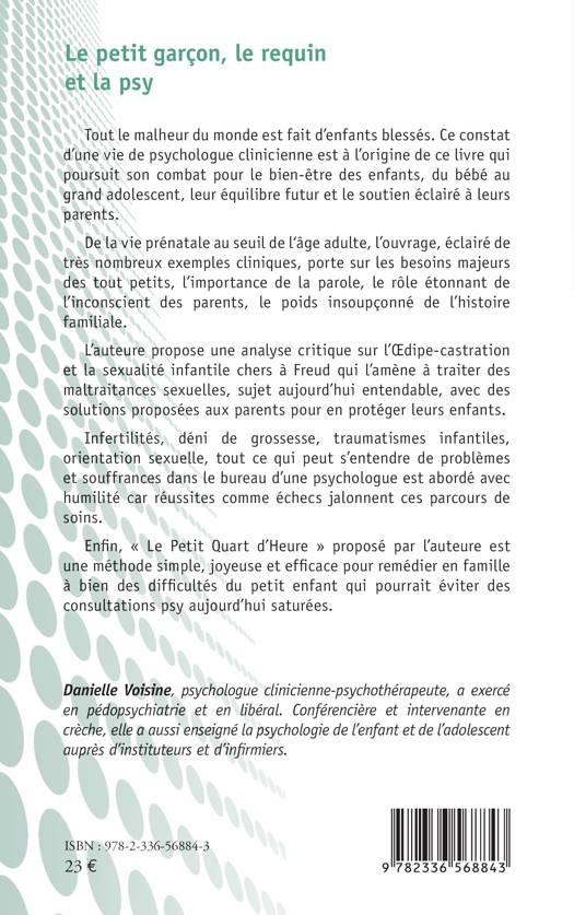 Tout le malheur du monde est fait d'enfants blessés. Ce constat d'une vie de psychologue clinicienne est à l'origine de ce livre qui poursuit son combat pour le bien-être des enfants, du bébé au grand adolescent, leur équilibre futur et le soutien éclairé à leurs parents. De la vie prénatale au seuil de l'âge adulte, l'ouvrage, éclairé de très nombreux exemples cliniques, porte sur les besoins majeurs des tout petits, l'importance de la parole, le rôle étonnant de l'inconscient des parents, le poids insoupçonné de l'histoire familiale. L'auteure propose une analyse critique sur l'OEdipe-castration et la sexualité infantile chers à Freud qui l'amène à traiter des maltraitances sexuelles, sujet aujourd'hui entendable, avec des solutions proposées aux parents pour en protéger leurs enfants. Infertilités, déni de grossesse, traumatismes infantiles, orientation sexuelle, tout ce qui peut s'entendre de problèmes et souffrances dans le bureau d'une psychologue est abordé avec humilité car réussites comme échecs jalonnent ces parcours de soins. Enfin, Le Petit Quart d'Heure proposé par l'auteure est une méthode simple, joyeuse et efficace pour remédier en famille à bien des difficultés du petit enfant qui pourrait éviter des consultations psy aujourd'hui saturées.