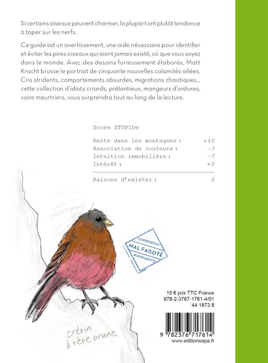 Ce petit guide est un avertissement, une aide nécessaire pour identifier et éviter les pires oiseaux qui aient jamais existé, où que vous soyez dans le monde. Avec des dessins furieusement élaborés, Matt Kracht brosse le portrait de cinquante nouvelles calamités ailées. Cris stridents, comportements absurdes, migrations chaotiques… cette collection d’idiots criards, prétentieux, mangeurs d’ordures, voire meurtriers, vous surprendra tout au long de la lecture.