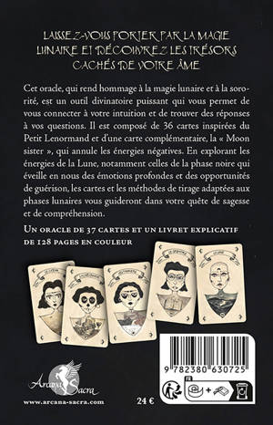 Laissez-vous porter par la magie lunaire et découvrez les trésors cachés de votre âme. Cet oracle, qui rend hommage à la magie lunaire et à la sororité, est un outil divinatoire puissant qui vous permet de vous connecter à votre intuition et de trouver des réponses à vos questions. Il est composé de 36 cartes inspirées du Petit Lenormand et d'une carte complémentaire, la « Moon sister », qui annule les énergies négatives. En explorant les énergies de la Lune, notamment celles de la phase noire qui éveille en nous des émotions profondes et des opportunités de guérison, les cartes et les méthodes de tirage adaptées aux phases lunaires vous guideront dans votre quête de sagesse et de compréhension.