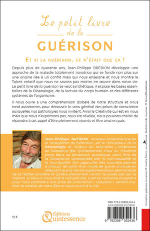 Depuis plus de quarante ans, Jean-Philippe Brébion développe une approche de la maladie totalement novatrice qui se fonde non plus sur une origine liée à un conflit mais qui nous enseigne et nous montre le Talent créatif que nous ne savons pas mettre en œuvre dans notre vie. « Le petit livre de la guérison » se veut synthétique, il expose les bases essentielles de la Bioanalogie, de la lecture du corps humain et des différents systèmes de l'organisme. Il nous ouvre à une compréhension globale de notre structure et nous rend autonomes pour découvrir le sens général des prises de conscience auxquelles nos pathologies nous invitent. Ainsi la Créativité qui est en nous mais que nous n'exprimons pas, nous est révélée, nous pouvons choisir de répondre à cet appel d'être pleinement vivants et être ainsi en paix. « Guérir, c'est choisir de vivre ! »