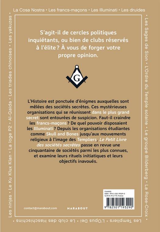 L'Histoire est ponctuée d'énigmes auxquelles sont mêlées des sociétés secrètes. Ces mystérieuses organisations qui se réunissent dans le plus grand secret sont entourées de suspicion. Faut-il craindre les francs-maçons ? De quel pouvoir disposaient les Illuminati ? Depuis les organisations étudiantes comme Skull and Bones jusqu'aux mouvements religieux à l'image des Templiers, Le Petit Livre des sociétés secrètes passe en revue une cinquantaine de sociétés parmi les plus connues, et examine leurs rituels initiatiques et leurs objectifs inavoués.
