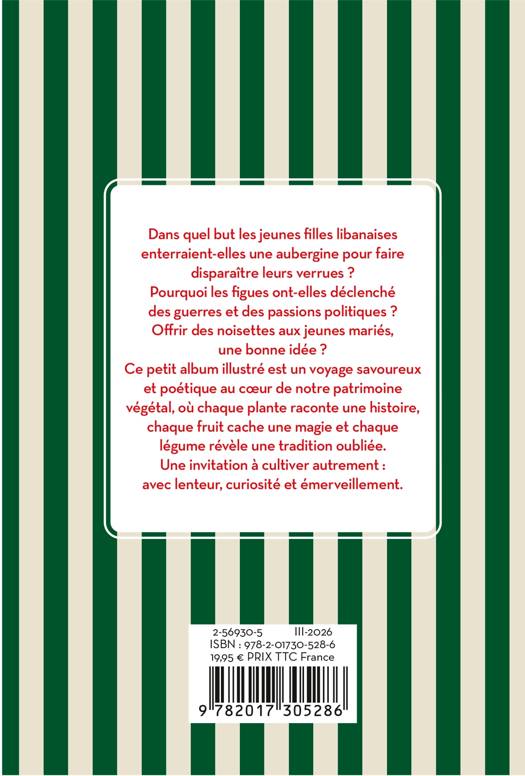 Dans quel but les jeunes filles libanaises enterraient-elles une aubergine pour faire disparaitre les verrues ? Pourquoi les figues ont-elles déclenché des guerres et des passions politiques ? Offrir des noisettes aux jeunes mariés, une bonne idée ? Ce petit album illustré est un voyage savoureux et poétique au cœur de notre patrimoine végétal, où chaque plante raconte une histoire, chaque fruit cache une magie et chaque légume révèle une tradition oubliée. Une invitation à cultiver autrement : avec lenteur, curiosité et émerveillement.