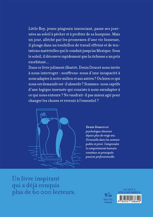Little Boy, jeune pingouin insouciant, passe ses journées au soleil à pêcher et à profiter de sa banquise. Mais un jour, alléché par les promesses d’une vie luxueuse, il plonge dans un tourbillon de travail effréné et de tentations matérielles qui le conduit jusqu’au Mexique. Sous le soleil, il découvre rapidement que la richesse a un prix exorbitant... Dans ce livre joliment illustré, Denis Doucet nous invite à nous interroger : souffrons-nous d’une incapacité à nous adapter à notre milieu et aux autres ? Ou bien ce qui nous est demandé est-il absurde ? Sommes-nous captifs d’une logique insensée qui consiste à nous suradapter à ce qui nous entoure ? Ne vaudrait-il pas mieux agir pour changer les choses et revenir à l’essentiel ?