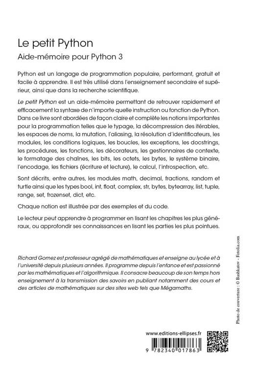 Le petit Python est un aide-mémoire permettant de retrouver rapidement et efficacement la syntaxe de n'importe quelle instruction ou fonction de Python. Dans ce livre sont abordées de façon claire et complète les notions importantes pour la programmation telles que le typage, la décompression des itérables, les espaces de noms, la mutation, l'aliasing, la résolution d'identificateurs, les modules, les conditions logiques, les boucles, les exceptions, les docstrings, les procédures, les fonctions, les décorateurs, les gestionnaires de contexte, le formatage des chaînes, les bits, les octets, les bytes, le système binaire, l'encodage, les fichiers (écriture et lecture), le calcul, l'introspection, etc.