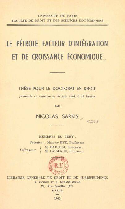 Dans quelle mesure le pétrole est-il facteur d'intégration et de croissance économique pour les pays exploitants ? Tel est le sujet de la thèse de Doctorat en droit présentée en juin 1961 par Nicolas Sarkis. Quand et comment fut découvert le pétrole dans les pays arabes ? Dans quel cadre juridique est-il exploité ? Son exploitation diffère-t'elle selon les pays ? Quels sont tous les aspects économiques liés à l'exploitation pétrolière ? Quel avenir pour le pétrole et, donc, pour les pays qui l'exploitent ?