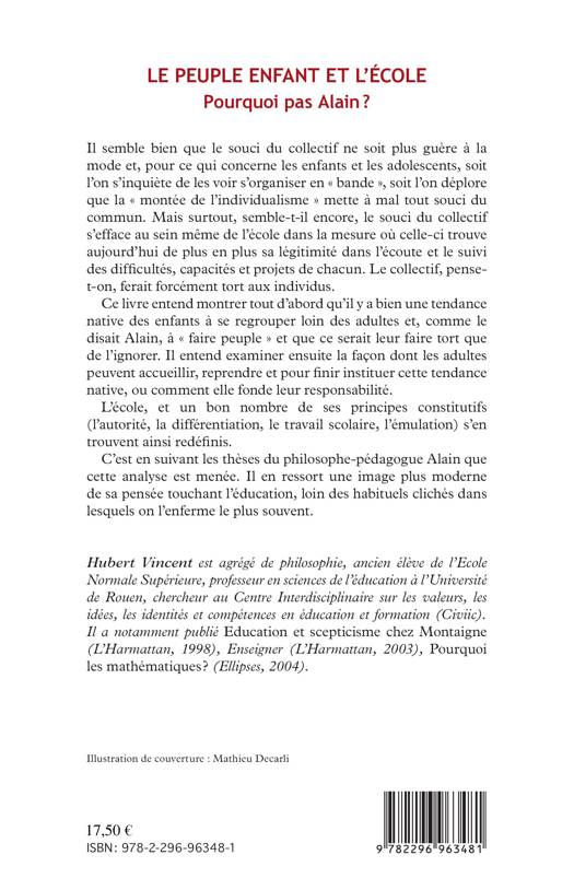 Il y a bien une tendance native des enfants à se regrouper loin des adultes, et comme le disait Alain, à "faire peuple", et ce serait leur faire tort que de l'ignorer. Comment les adultes peuvent-ils accueillir, reprendre et instituer cette tendance native ? L'école, et un bon nombre de ses principes constitutifs (l'autorité, la différentiation, le travail scolaire, l'émulation), s'en trouvent ainsi redéfinis. C'est en suivant les thèses du philosophe-pédagogue Alain que cette analyse est menée.