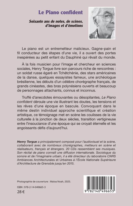 Le piano est un entremetteur malicieux. Gagne-pain et fil conducteur des étapes d'une vie, il a ouvert des portes inespérées au petit enfant du Dauphiné qui rêvait du monde. À la fois musicien pour l'image et chercheur en sciences sociales, Henry Torgue livre son parcours riche de rencontres : un soldat russe égaré en Tchétchénie, des stars américaines de la danse, quelques essayistes fameux, une archéologue brésilienne, les débuts d'un célèbre chorégraphe français, de grands cinéastes, des bras polynésiens ouverts et beaucoup de personnages attachants, connus et inconnus. Truffé d'anecdotes émouvantes ou désopilantes, Le Piano confident déroule une vie illustrant les doutes, les tensions et les rêves d'une époque en bascule. Convoquant dans le même destin individuel approche scientifique et création artistique, ce témoignage met en scène les coulisses de la vie culturelle à la jonction de deux siècles, transition vertigineuse entre l'insouciance d'une époque qui se croyait éternelle et les angoissants défis d'aujourd'hui.
