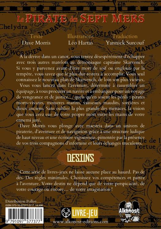 À la dérive dans un canot, vous tentez désespérément d’échapper avec trois autres matelots au démoniaque capitaine Skarvench. Si vous y parvenez avant d’être mort de soif ou englouti par la tempête, vous savez que le plus dur restera à accomplir. Vous seul connaissez le nouveau plan de Skarvench, de loin son plus vicieux. Vous vous lancez dans l’aventure, déterminé à rassembler un équipage, à vous procurer un navire et à embarquer pour un voyage de vengeance et de justice... quels qu'en soient les périls : pirates morts-vivants, monstres marins, vaisseaux maudits, sorcières et dieux anciens. Sans oublier la plus grande des menaces, la vision que vous avez eue de votre propre mort entre les mains de votre ennemi juré. Dave Morris vous plonge avec maestria dans un univers de piraterie, d’aventure et de navigation grâce à une structure ludique de haut niveau et une écriture vigoureuse, pimentée par la présence de vos trois compagnons d’infortune et leurs échanges truculents. Cette série de livres-jeux ne laisse aucune place au hasard. Pas de dés. Des règles minimales. Choisissez vos compétences et partez à l’aventure. Votre destin ne dépend que de votre perspicacité, de votre courage ou encore... de votre imaginationâ!